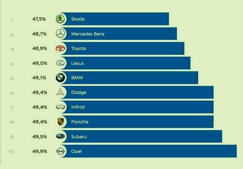 В итоговом рейтинге по странам происхождения брендов самыми надежными были признаны автомобили немецких (49,4% поломок), японские (50,1%) и корейские (50,7%) автомобили; в целом по Европе доля поломок составила 49,7%.
